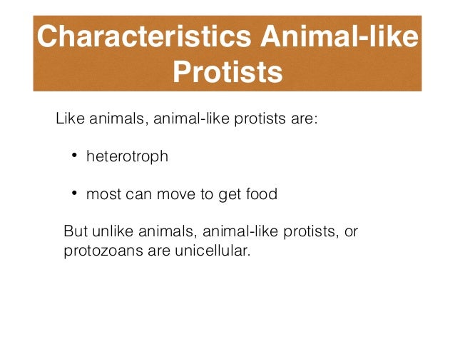 Previously protozoa were specified as unicellular protists possessing animal-like characteristics such as the capability to move in water. Animal like protists also known as protozoa are heterotrophic and feed on others. 3some are multicellular algoe 4can be heterotrophic or outorophic.